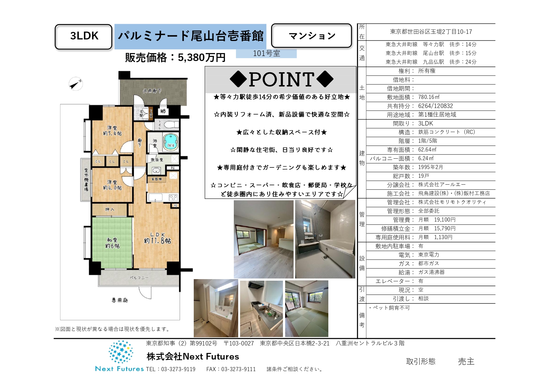 パルミナード尾山台壱番館1階専用庭付き リフォーム実施物件販売開始致しました!!