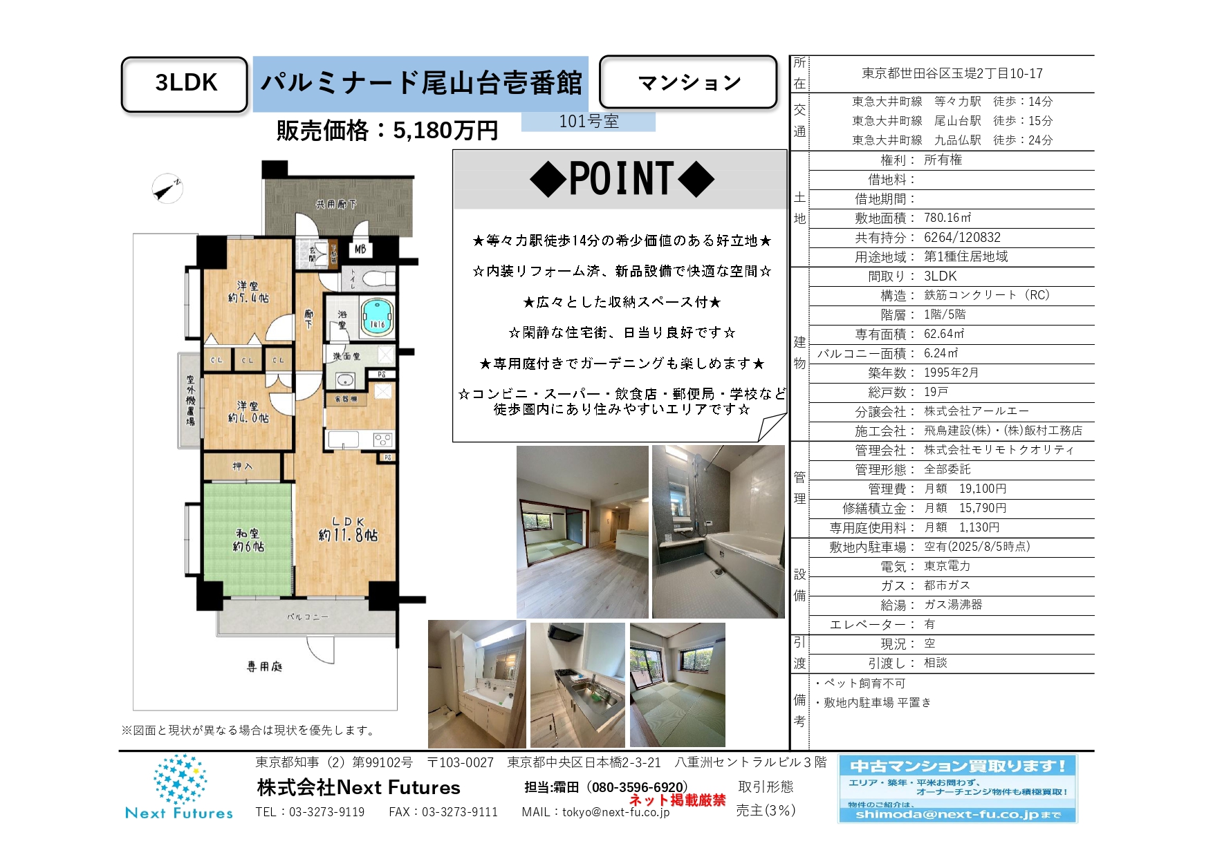 パルミナード尾山台壱番館1階専用庭付き リフォーム実施物件販売開始致しました!!